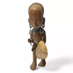 A lovely wooden carved figurine of a Maasai hunter.  Includes Shield, Knife, Necklace, Earings and Teeth!
