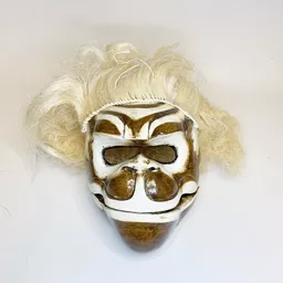 Carved wooden Hanuman Mask with hinged jaw and coir hair.