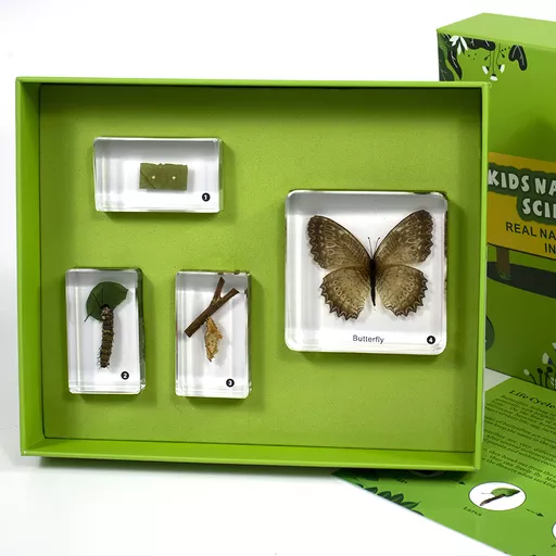 4 Resin Blocks showing the Life Cycle of a Butterfly set in resin, this comes in its own storage box.