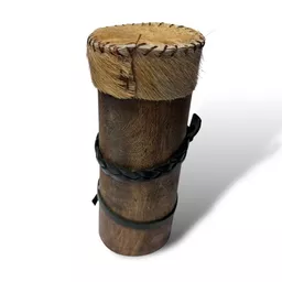 Wooden food storage pots with leather decoration and animal skin lids, all vary - approx 20cm. tall.