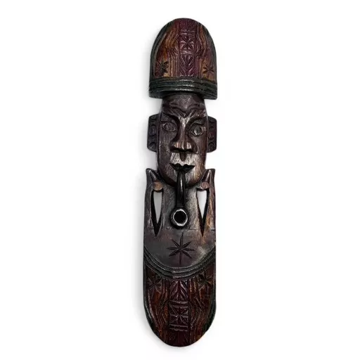 Long stylish wooden mask made from acacia wood with a dark stain, carved and painted detail and given a wax finish. Each one has been carved in Northern Thailand.