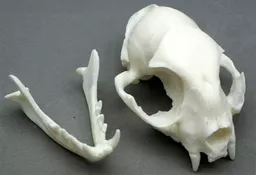 Very detailed replica cat skull. The skull is cast in an ivory, bone coloured polyurethane resin & has an interlocking bottom jaw which has been cast seperately.and measures approx 10cm long. UK.